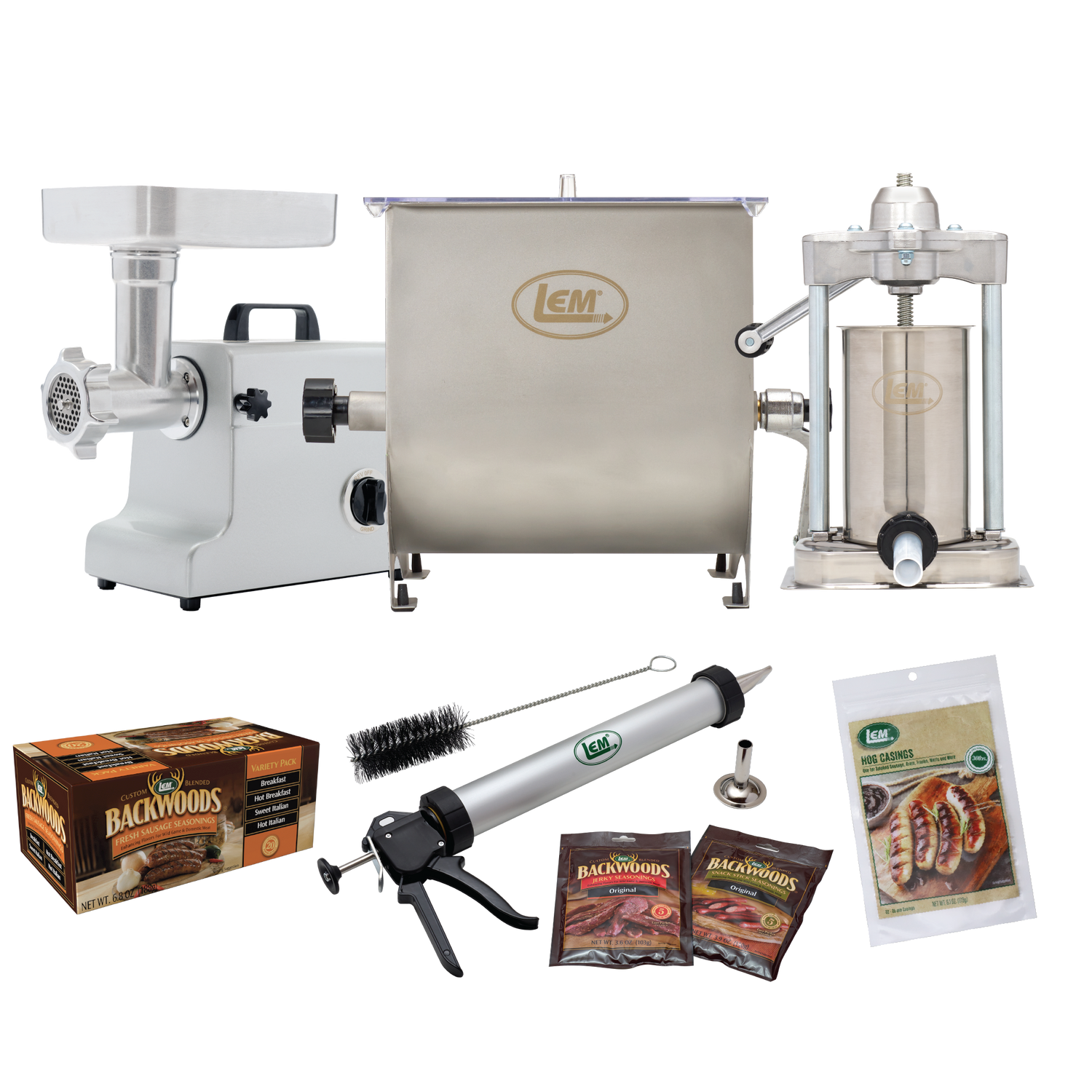 New to meat processing? The Ultimate Starter Bundle has everything you need to begin grinding, stuffing, mixing, and making fresh sausage and jerky at home. This complete set includes the MightyBite® #8 Aluminum Grinder (SKU: 1158), MightyBite® 5 lb. Stuffer with Plastic Stuffing Tubes (SKU: 1606), MightyBite® Manual 20 lb. Meat Mixer (SKU: 654), Jerky Cannon® (SKU: 468BB), Natural Hog Casings (32–35mm) – 6 oz. bag (SKU: 141), and Backwoods® Fresh Sausage Seasoning Variety Pack (SKU: 9016). Designed for beginners, this bundle delivers reliable performance and delicious results.